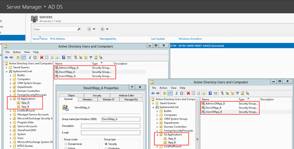 1. In Active Directory Server Console create groups of users for App A and App B: Admins, Developers, and Users.